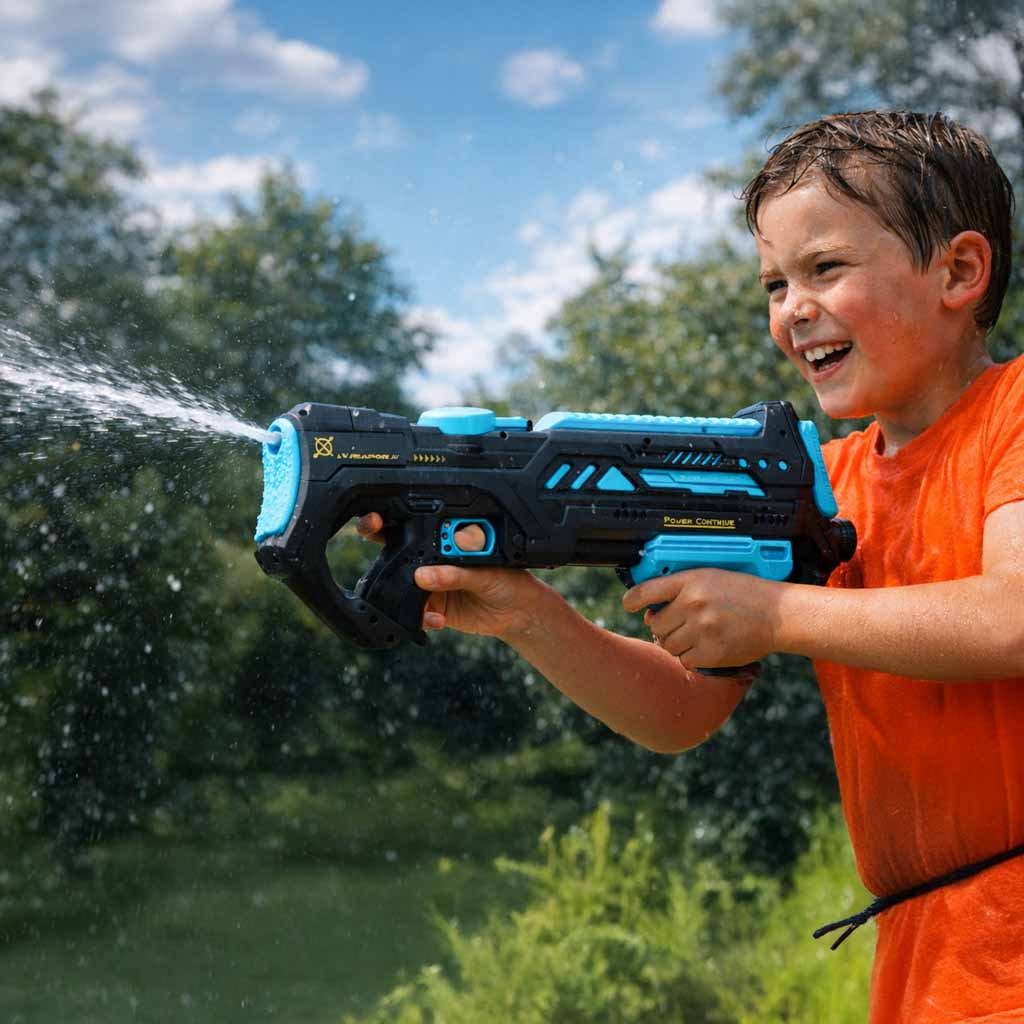 3. Czy 200 ml pojemności to nie za mało? To celowy zabieg konstrukcyjny. Dzięki temu karabin pozostaje lekki i poręczny nawet po napełnieniu, co pozwala dziecku na szybkie bieganie i uniki. System szybkiego napełniania sprawia, że brak wody uzupełnisz w kilka sekund.