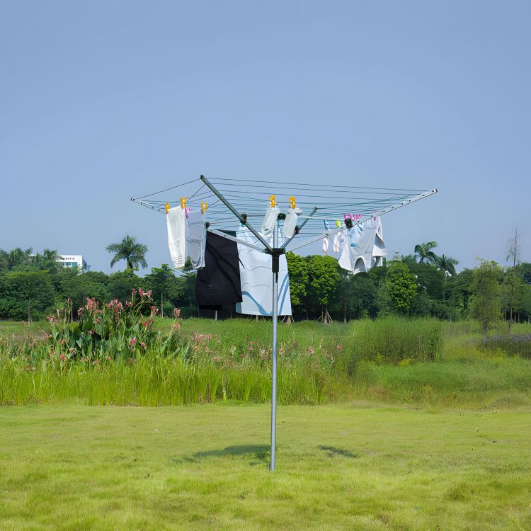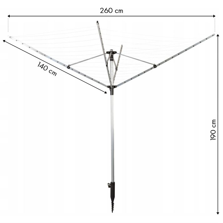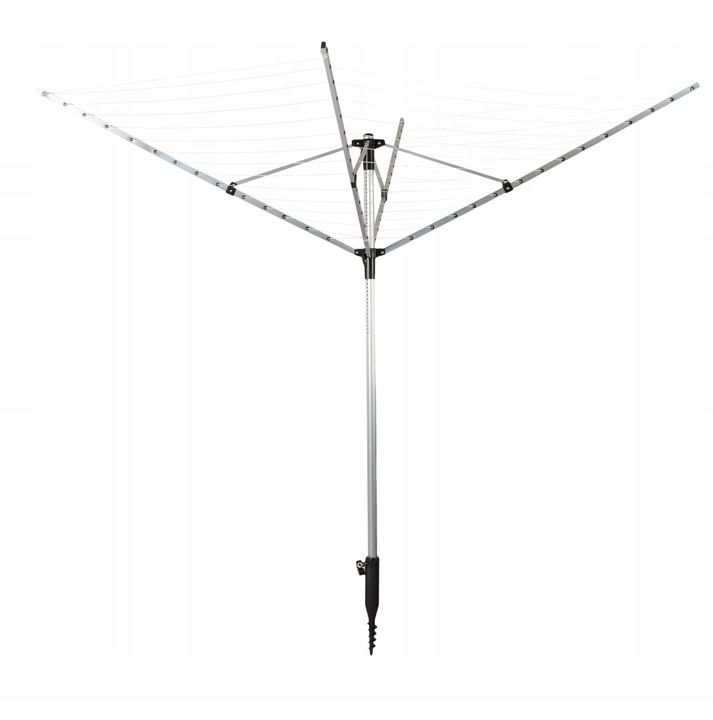 1. Czy suszarka nie przewróci się przy silnym wietrze? Dzięki zastosowaniu świdra głęboko osadzonego w ziemi oraz stabilnych, aluminiowych ramion, suszarka zachowuje stabilność. Dodatkowo, funkcja obrotowa sprawia, że podmuchy wiatru „prześlizgują się” po konstrukcji, zamiast stawiać jej opór.